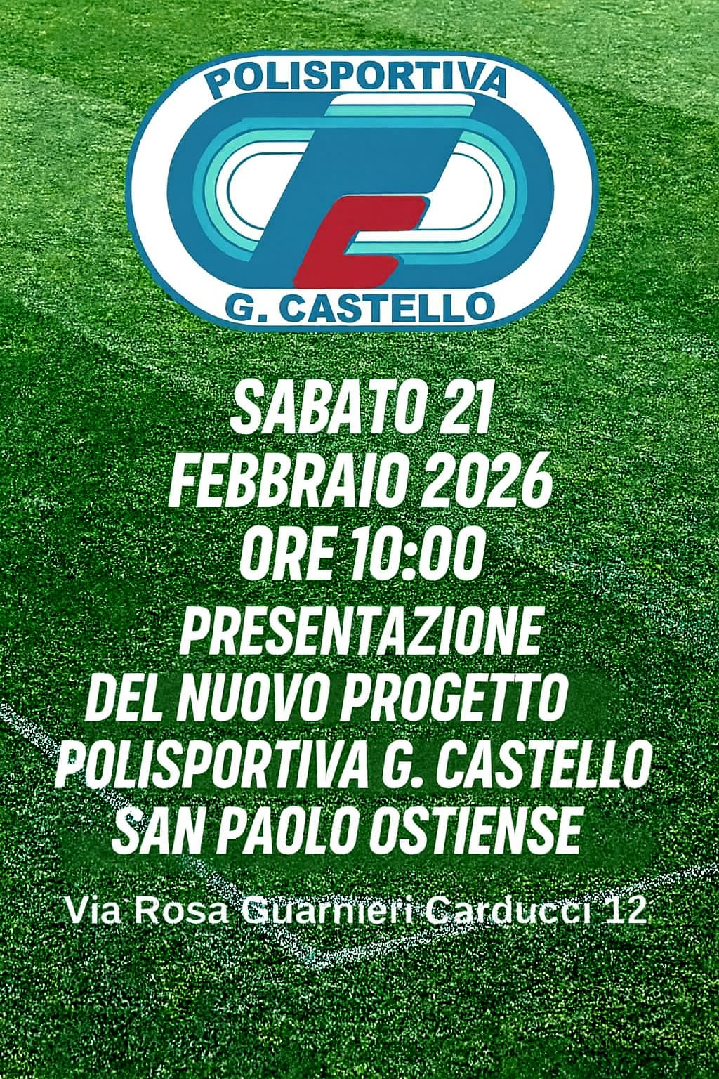 Sabato 21 Febbraio alle ore 10, ci sarà, presso la nostra sede in Via Rosa Guarnieri Carducci, 12, la presentazione del progetto G.Castello sez. San Paolo Ostiense. Oltre agli atleti, dirigenti e allenatori di tutte le nostre categorie, saranno presenti all’evento alcune autorità istituzionali del Comune di Roma
